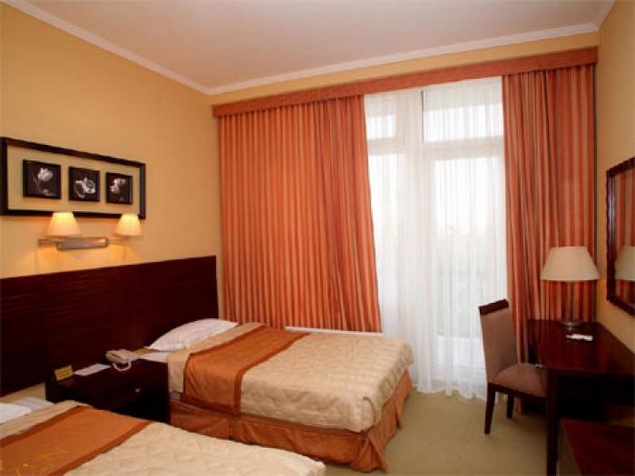 Апартаменты (двухместные) (4-персоны) трехкомнатный номер (прихожая, гостиная, спальня, кабинет) с двумя балконами. В номере одна двуспальная кровать, мягкая мебель и другие предметы убранства, 2 сан. узла. В номер можно поставить 2 дополнительных кровати.