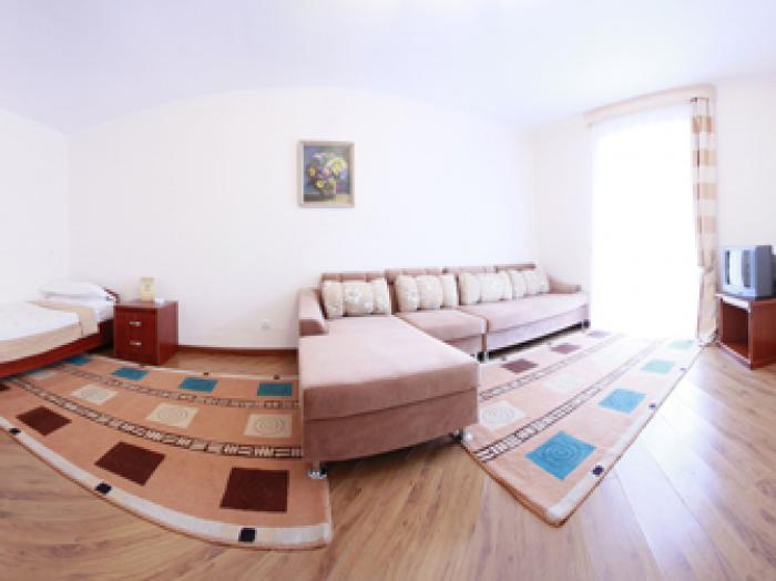 – Просторная гостиная с мягкой мебелью, журнальным столиком, телевизором, полуторная кровать с прикроватной тумбочкой – Спальная комната с тремя полуторными кроватями; прикроватные тумбочки, шифоньер, комод с зеркалом. – Санузел. – Прихожая -Терраса с плетёной мебелью. Во всех номерах: спутниковое ТВ, телефон, холодильник, отдельный санузел, регулируемое отопление (круглогодично), кухонная зона (в коттеджах), набор посуды для чая/кофе, чайник, фен, халат, тапочки, пляжные матрасы, пляжные полотенца, шампунь, гель для душа, мыло, зубная щетка. В стоимость номера входит: – Проживание – Питание 3-х разовое – завтрак (шведский стол), обед, ужин. В летнее время – для детей детское меню – 3 процедуры по назначению врача в SPA-центре. Уборка номера – ежедневно. Смена постельного белья – через каждые 3 дня. |